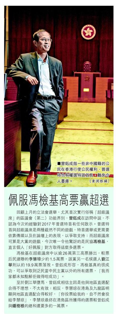 回顧上月的立法會選舉,尤其首次實行俗稱「超級議席」的區議會(第二)功能界別,曾鈺成在訪問中說,不認為今次的經驗對2017 年普選特首有任何啟示。普選特首與超級議席是兩種截然不同的遊戲,特首選舉或更需要依靠傳媒以及在論壇上的表現,以爭取支持;而超級議席可算是大黨的遊戲,今次唯一令他驚訝的是民協馮檢基,直言個人「好佩服」對方取得這麼多選票。