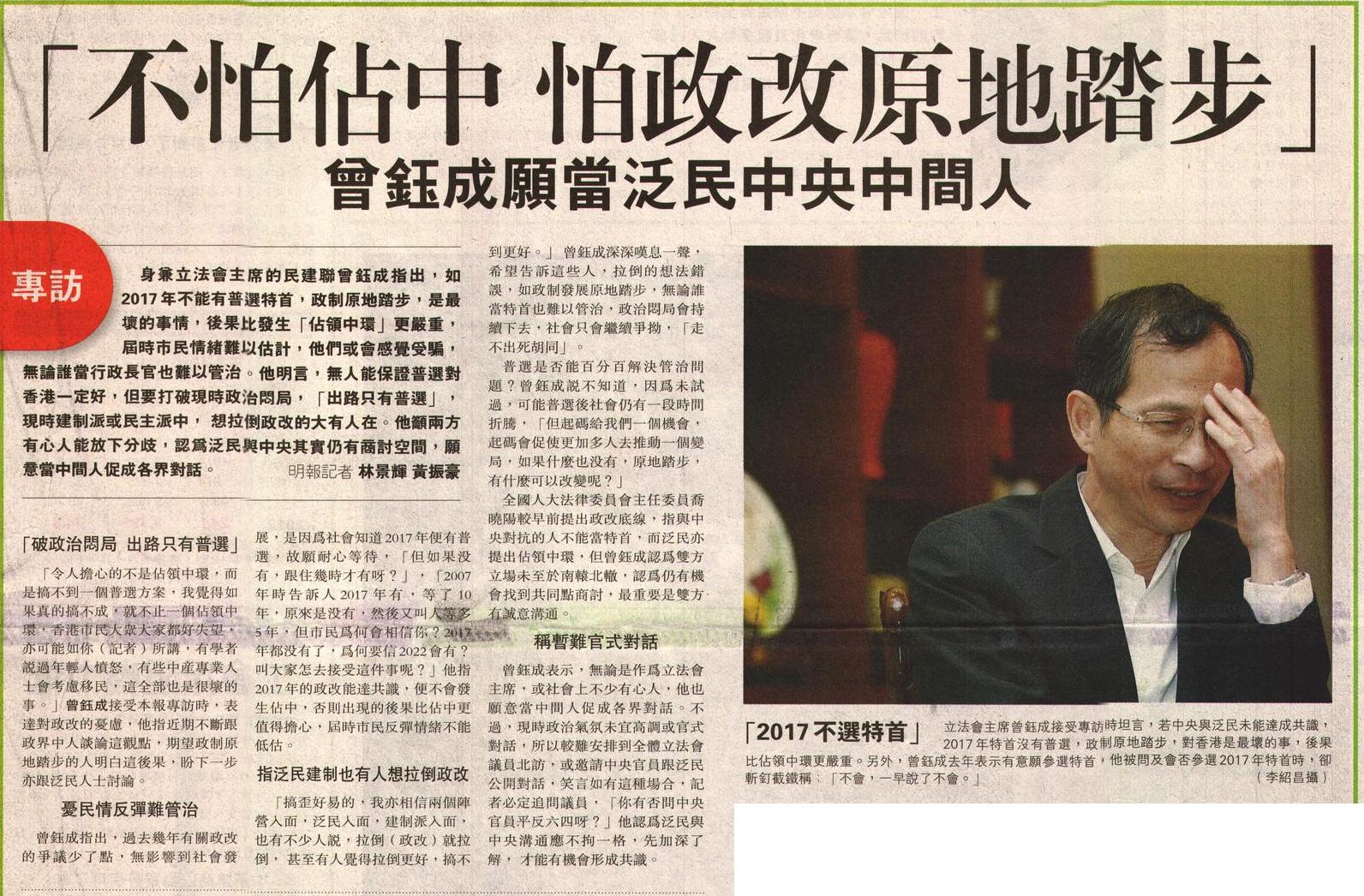 身兼立法會主席的民建聯曾鈺成指出,如2017 年不能有普選特首,政制原地踏步,是最壞的事情,後果比發生「佔領中環」更嚴重,屆時市民情緒難以估計,他們或會感覺受騙,無論誰當行政長官也難以管治。他明言,無人能保證普選對香港一定好,但要打破現時政治悶局, 「出路只有普選」,現時建制派或民主派中, 想拉倒政改的大有人在。他籲兩方有心人能放下分歧,認為泛民與中央其實仍有商討空間,願意當中間人促成各界對話。