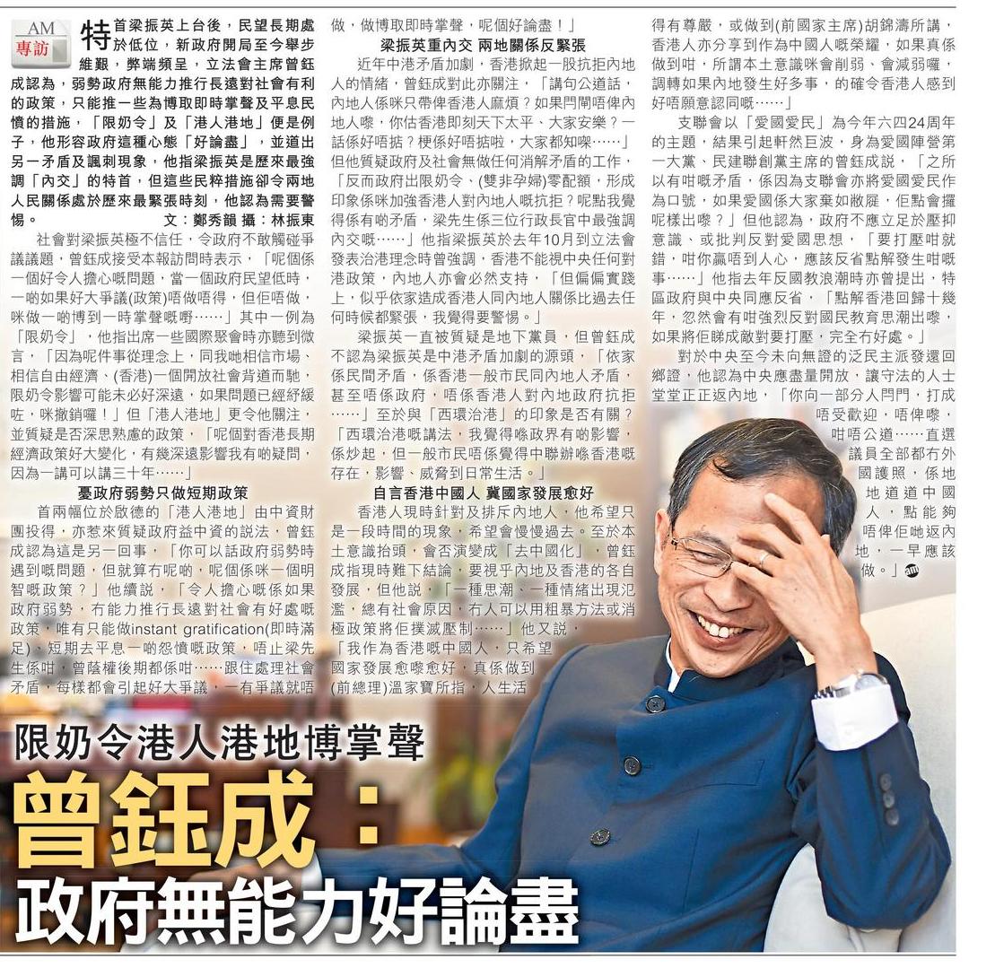首兩幅位於啟德的「港人港地」由中資財團投得,亦惹來質疑政府益中資的說法,曾鈺成認為這是另一回事,「你可以話政府弱勢時遇到嘅問題,但就算冇呢啲,呢個係咪一個明智嘅政策?」他續說,「令人擔心嘅係如果政府弱勢,冇能力推行長遠對社會有好處嘅政策,唯有只能做instant gratification(即時滿足)、短期去平息一啲怨憤嘅政策,唔止梁先生係咁,曾蔭權後期都係咁……跟住處理社會矛盾,每樣都會引起好大爭議,一有爭議就唔做,做博取即時掌聲,呢個好論盡!」