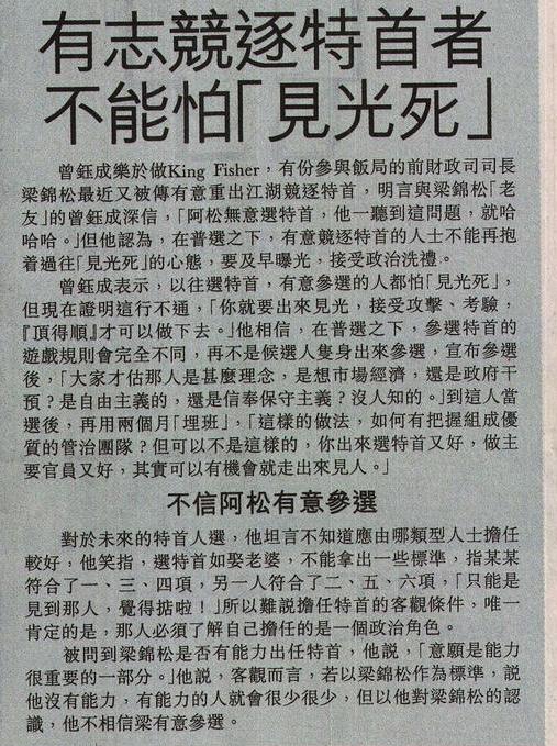 曾鈺成樂於做King Fisher,有份參與飯局的前財政司司長梁錦松最近又被傳有意重出江湖競逐特首,明言與梁錦松「老友」的曾鈺成深信,「阿松無意選特首,他一聽到這問題,就哈哈哈。」但他認為,在普選之下,有意競逐特首的人士不能再抱過往「見光死」的心態,要及早曝光,接受政治洗禮。