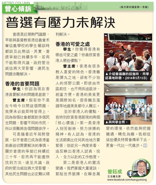 普選是近期熱門議題,早前與基督教香港信義會禾輋信義學校的學生 暢談時都談及此熱話,其實,普選爭拗已持續多年,若再不能取得共識,政府管治威信將大受影響,連民生問題亦難解決。