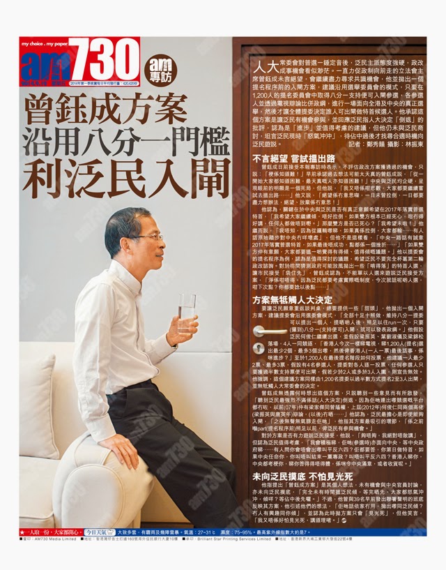 人大常委會對普選一錘定音後,泛民主派態度強硬,政改成事機會看似渺茫。一直力促政制向前走的立法會主席曾鈺成未言絕望,會繼續盡力尋求共識機會,他並拋出一個提名程序前的入閘方案,建議沿用選舉委員會的模式,只要在1,200人的提名委員會中取得八分一支持便可入閘參選,各參選人並透過電視辯論比併政綱,進行一場面向全港及中央的真正選舉,然後才讓全體提委決定誰人可出閘做特首候選人。他承認這個方案是讓泛民有機會參與,並回應泛民指人大決定「倒退」的批評,認為是「進步」並值得考慮的建議,但他仍未與泛民商討,坦言泛民現時「怒氣沖沖」,待佔中過後才找尋合適時機向泛民遊說。 記者:鄭秀韻 攝影:林振東