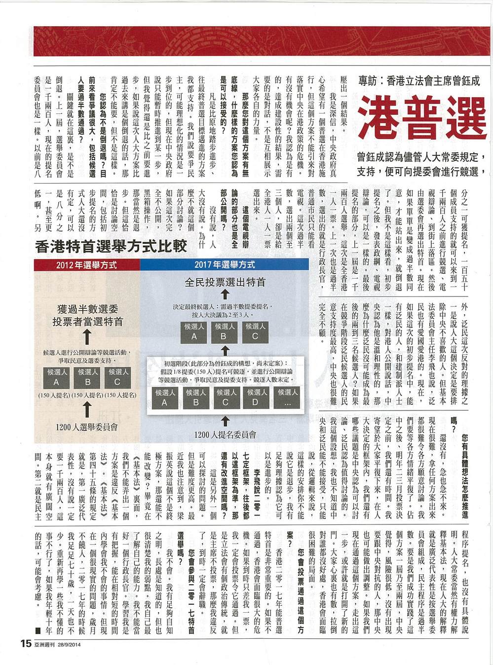 全國人大常委就香港二零一七年行政長官普選定下框架,規定提名委員會參照過往選舉委員會組成、候選人數二至三人以及過半提委提名等。香港泛民主派人士認為框架過於嚴苛、不符合國際標準,泛民議員表明會在立法會否決方案,「佔領中環」也將在近期發起。香港的普選之路會否就此中止?兩極化的民意還有否再度凝聚的機會?亞洲週刊就政改問題專訪香港立法會主席曾鈺成,詳談人大框架訂立之後,香港的普選之路還能如何走下去。