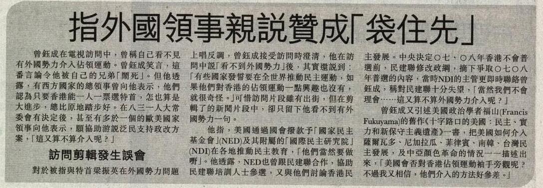 曾鈺成又引述美國政治學者福山(Francis Fukuyama)的舊作《十字路口的美國:民主、實力和新保守主義遺產》一書,把美國如何介入薩爾瓦多、尼加拉瓜、菲律賓、南韓、台灣民主發展,及中亞顏色革命的情況一一描述出來,「美國會否對香港佔領運動袖手旁觀呢?不過我又相信,他們介入的方法好參差。」