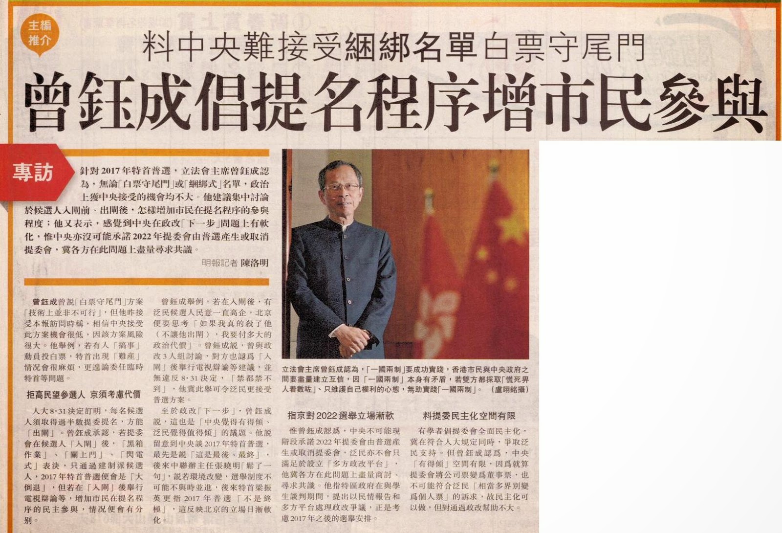 針對2017 年特首普選,立法會主席曾鈺成認為,無論「白票守尾門」或「綑綁式」名單,政治上獲中央接受的機會均不大。他建議集中討論於候選人入閘前、出閘後,怎樣增加市民在提名程序的參與程度;他又表示,感覺到中央在政改「下一步」問題上有軟化,惟中央亦沒可能承諾2022 年提委會由普選產生或取消提委會,冀各方在此問題上盡量尋求共識。
