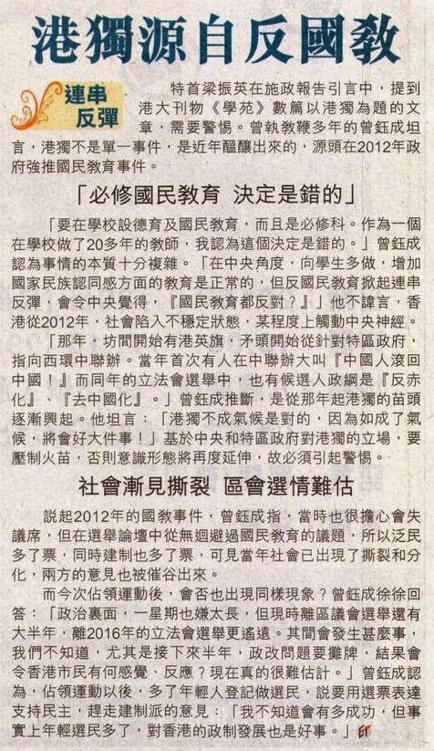 特首梁振英在施政報告引言中,提到港大刊物《學苑》數篇以港獨為題的文章,需要警惕。曾執教鞭多年的曾鈺成坦言,港獨不是單一事件,是近年醞釀出來的,源頭在2012年政府強推國民教育事件。