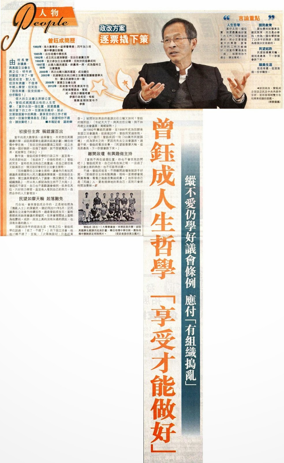 由校長變身議員,再高踞立法會主席之位,明年終於要退下來了。曾鈺成坦言,對人生從沒有規劃,不值得年輕人學習,但笑指:「我很幸運,從沒投過一份求職信!」