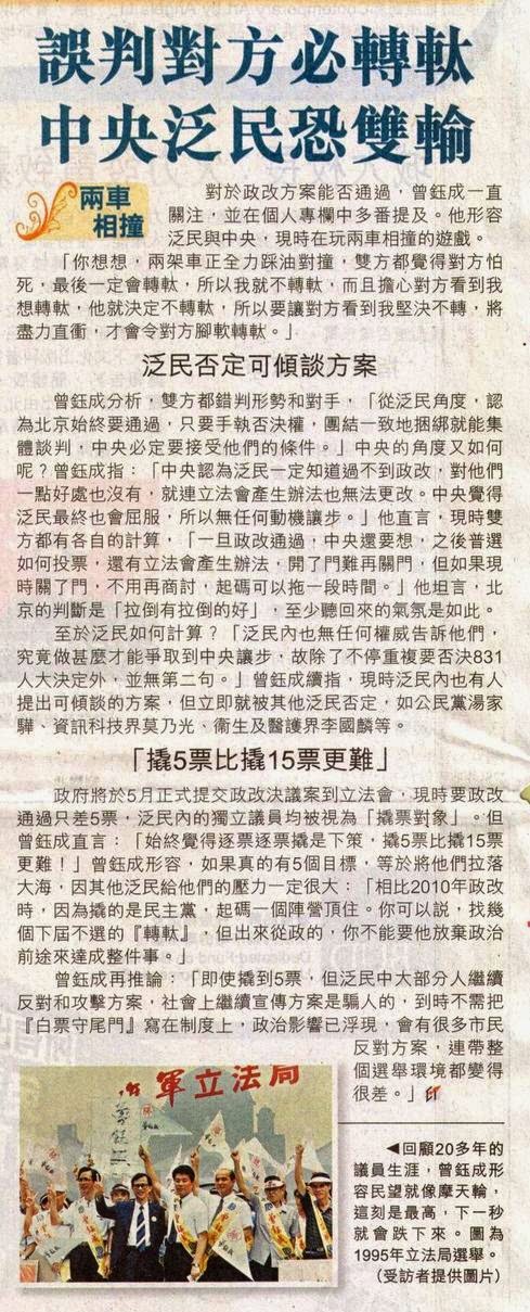 對於政改方案能否通過,曾鈺成一直關注,並在個人專欄中多番提及。他形容泛民與中央,現時在玩兩車相撞的遊戲。