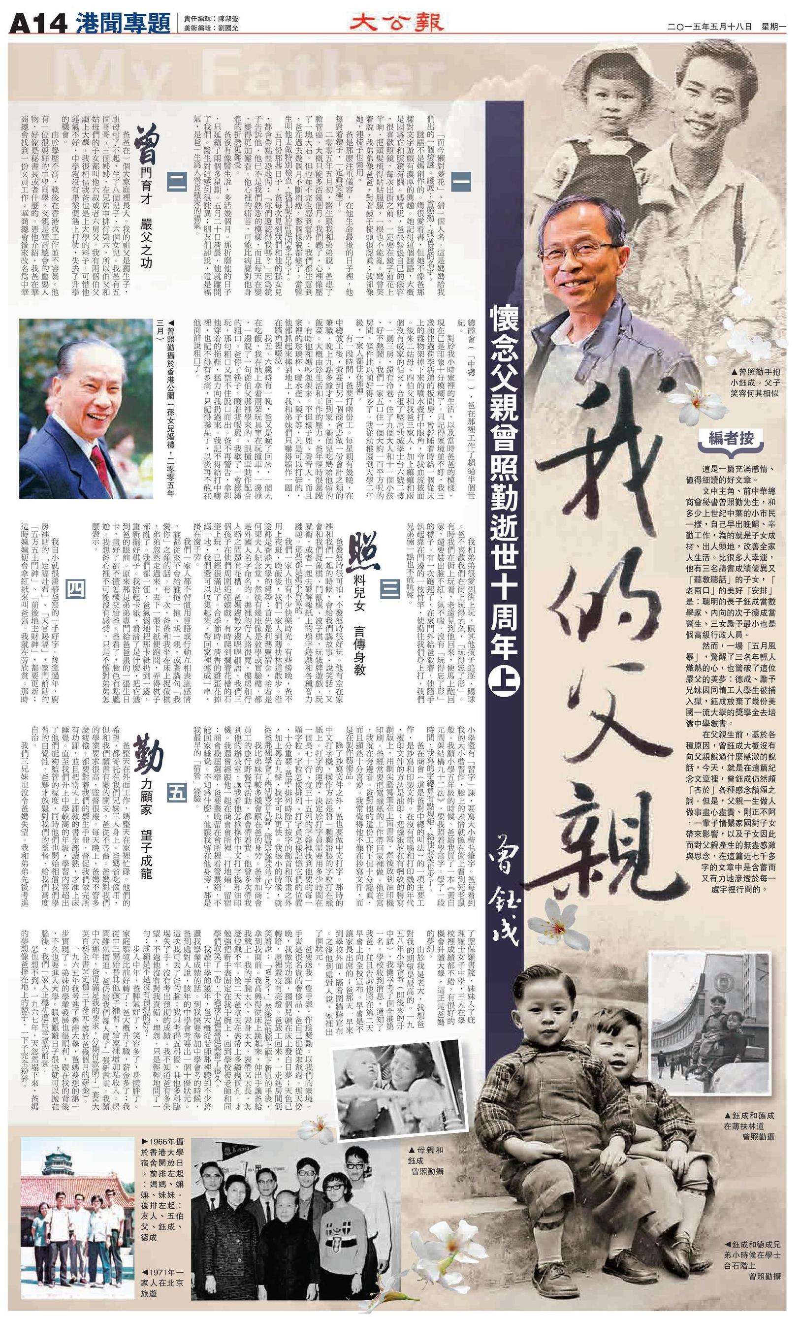 這是一篇充滿感情、值得細讀的好文章。文中主角、前中華總商會秘書曾照勤先生,和多少上世紀中葉的小市民一樣,自己早出晚歸、辛勤工作,為的就是子女成材、出人頭地,改善全家人生活。比很多人幸運,他有三名讀書成績優異又「聽教聽話」的子女, 「老兩口」的美好「安排」是:聰明的長子鈺成當數學家、內向的次子德成當醫生、三女勵予最小也是個高級行政人員。