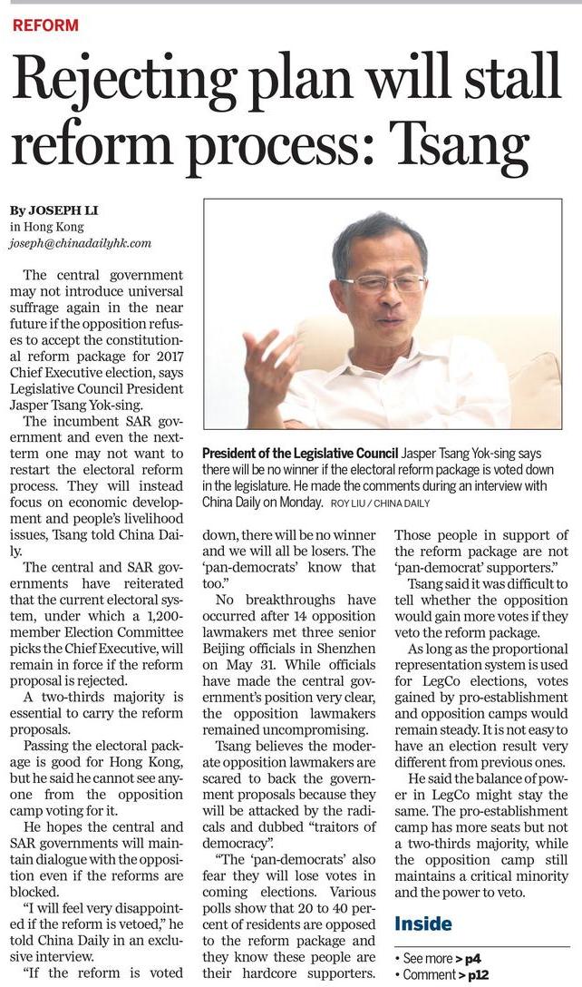 “If the reform is voted down,therewillbenowinner and we will all be losers. The ‘pan-democrats’ know that too.”