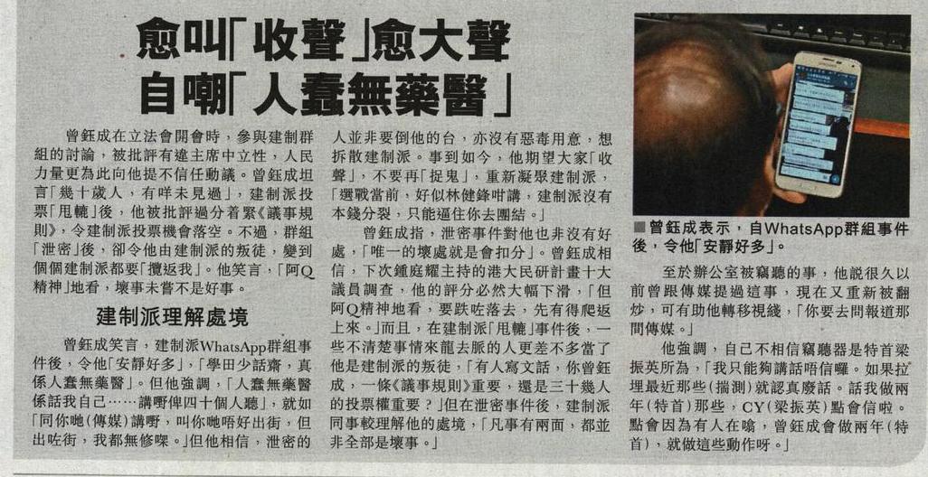曾鈺成笑言,建制派WhatsApp群組事件後,令他「安靜好多」,「學田少話齋,真係人蠢無藥醫」。但他強調,「人蠢無藥醫係話我自己……講嘢俾四十個人聽」,就如「同你哋(傳媒)講嘢,叫你哋唔好出街,但出咗街,我都無修㗎。」但他相信,泄密的人並非要倒他的台,亦沒有惡毒用意,想拆散建制派。事到如今,他期望大家「收聲」,不要再「捉鬼」,重新凝聚建制派,「選戰當前,好似林健鋒咁講,建制派沒有本錢分裂,只能逼住你去團結。」