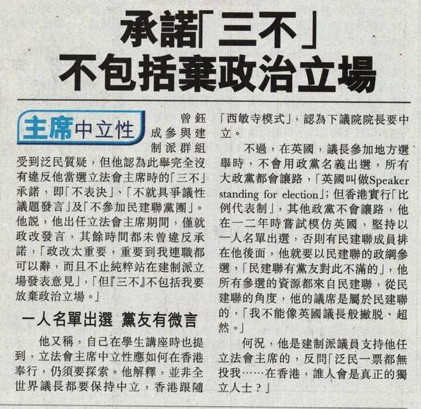 何況,他是建制派議員支持他任立法會主席的,反問「泛民一票都無投我……在香港,誰人會是真正的獨立人士?」
