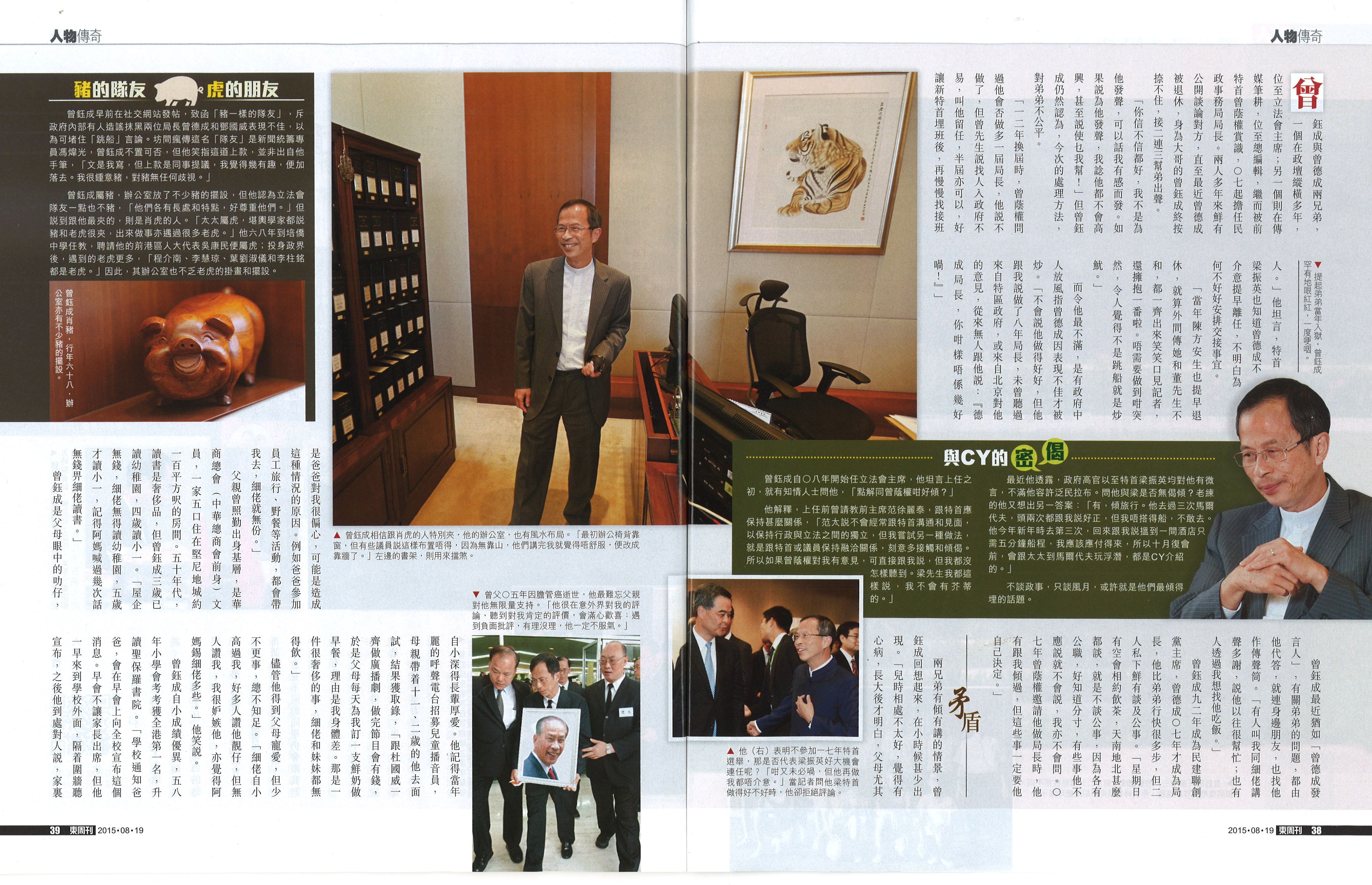 曾鈺成九二年成為民建聯創黨主席,曾德成○七年才成為局長,他比弟弟行快很多步,但二人私下鮮有談及公事。「星期日有空會相約飲茶,天南地北甚麼都談,就是不談公事,因為各有公職,好知道分寸,有些事他不應說就不會說,我亦不會問。○七年曾蔭權邀請他做局長時,他有跟我傾過,但這些事一定要他自己決定。」