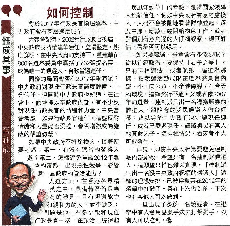 中央政府對現任行政長官高度評價、十分信任。但同時中央政府也知道,在社會上、議會裡以至政府內部,有不少反對現任行政長官的情緒和力量。中央當會考慮,如果行政長官連任,這些反對情緒和力量能否受控,會否增強成為施政的嚴重妨礙?