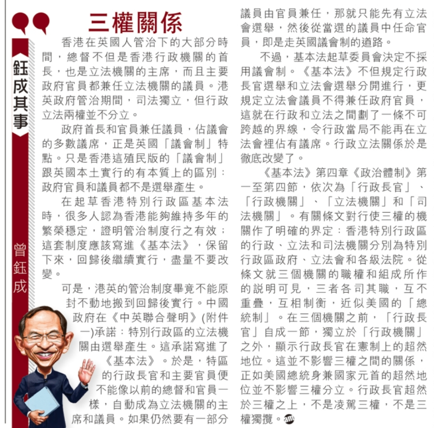 不過,基本法起草委員會決定不採用議會制。《基本法》不但規定行政長官選舉和立法會選舉分開進行,更規定立法會議員不得兼任政府官員,這就在行政和立法之間劃了一條不可跨越的界線,令行政當局不能再在立法會裡佔有議席。行政立法關係於是徹底改變了。