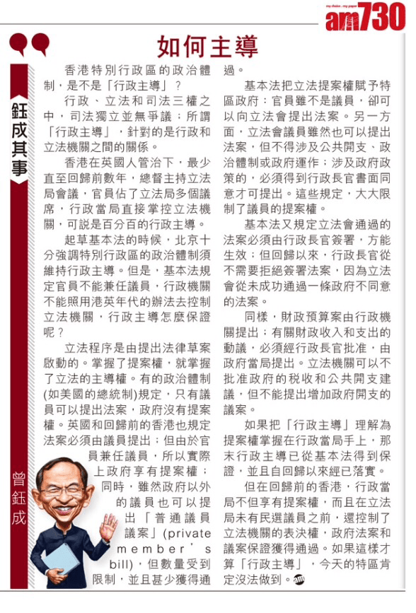 如果把「行政主導」理解為提案權掌握在行政當局手上,那末行政主導已從基本法得到保證,並且自回歸以來經已落實。