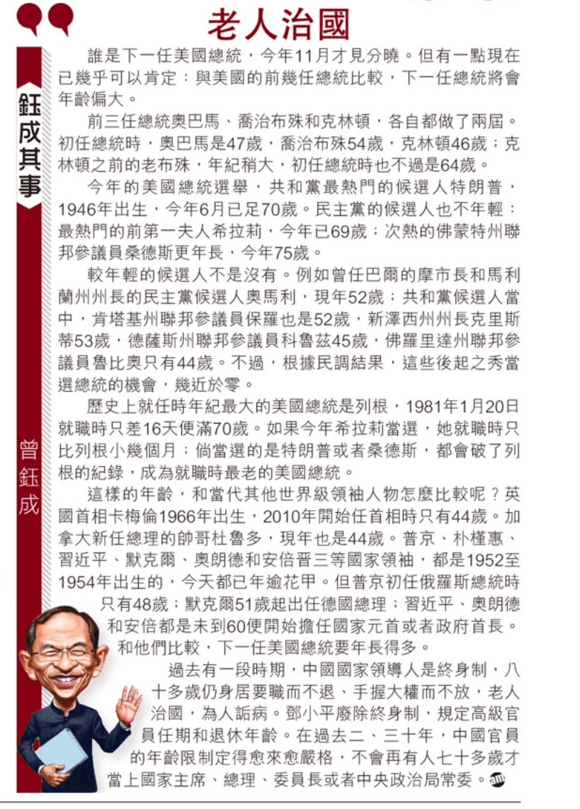 今年的美國總統選舉,共和黨最熱門的候選人特朗普,1946年出生,今年6月已足70歲。民主黨的候選人也不年輕:最熱門的前第一夫人希拉莉,今年已69歲;次熱的佛蒙特州聯邦參議員桑德斯更年長,今年75歲。