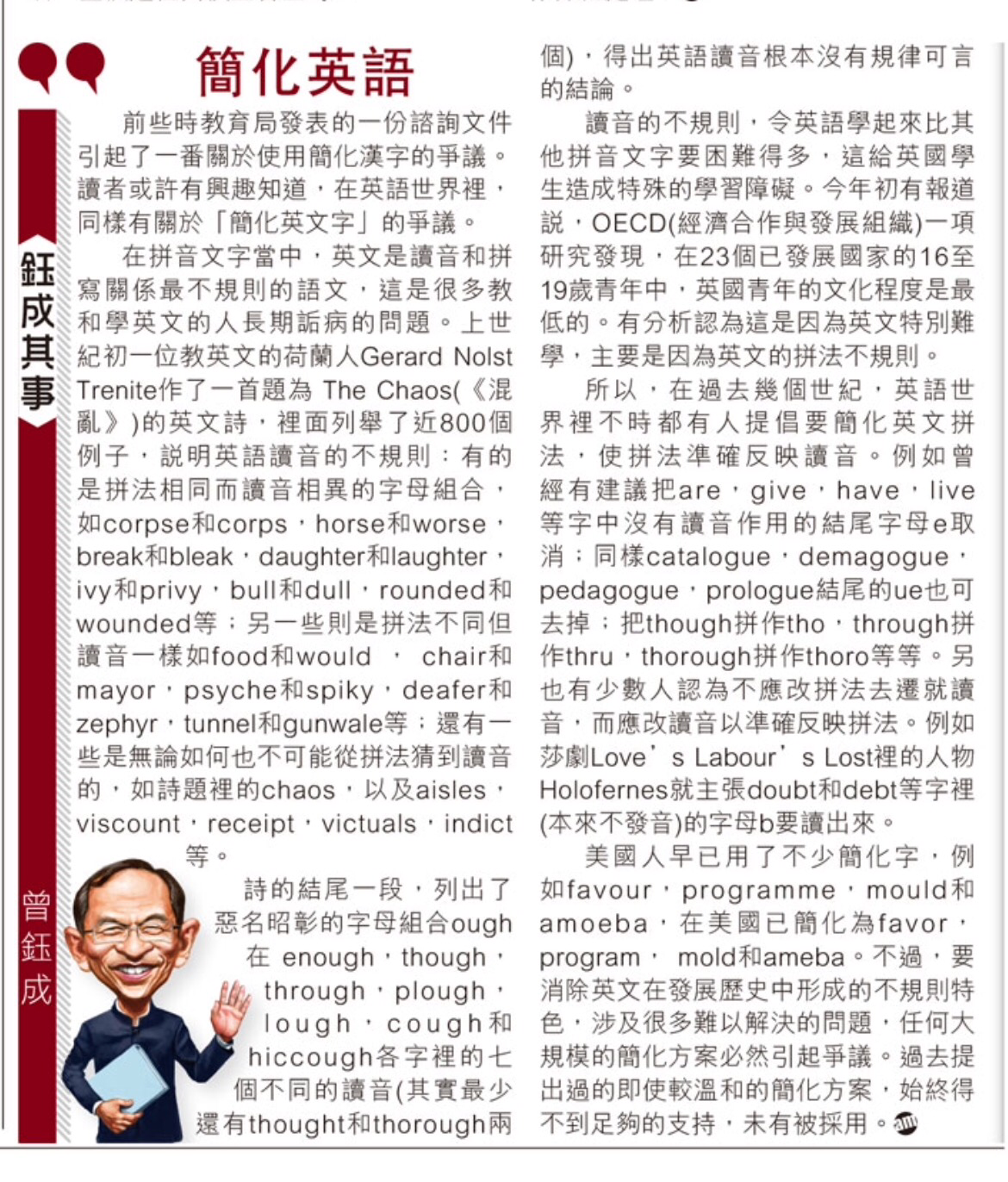 前些時教育局發表的一份諮詢文件引起了一番關於使用簡化漢字的爭議。讀者或許有興趣知道,在英語世界裡,同樣有關於「簡化英文字」的爭議。