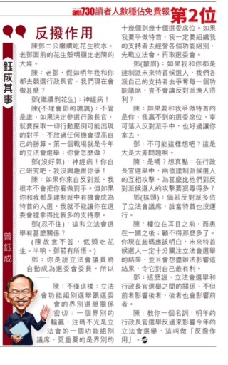 陳:教你一個名詞:明年的行政長官選舉反過來影響今年的立法會選舉,這叫做「反撥作用」。