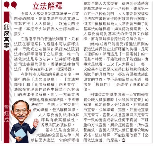 例如這次對基本法第一百零四條有關公職人員就職時「必須依法宣誓」的解釋,規定宣誓人必須真誠、莊重地進行宣誓,必須準確、完整、莊重地宣讀法定誓言;宣誓人故意宣讀與法定誓言不一致的誓言或者以任何不真誠、不莊重的方式宣誓,屬於拒絕宣誓,所作宣誓無效,宣誓人即喪失就任相應公職的資格。這些解釋,不能說是改變了「必須依法宣誓」的原義。