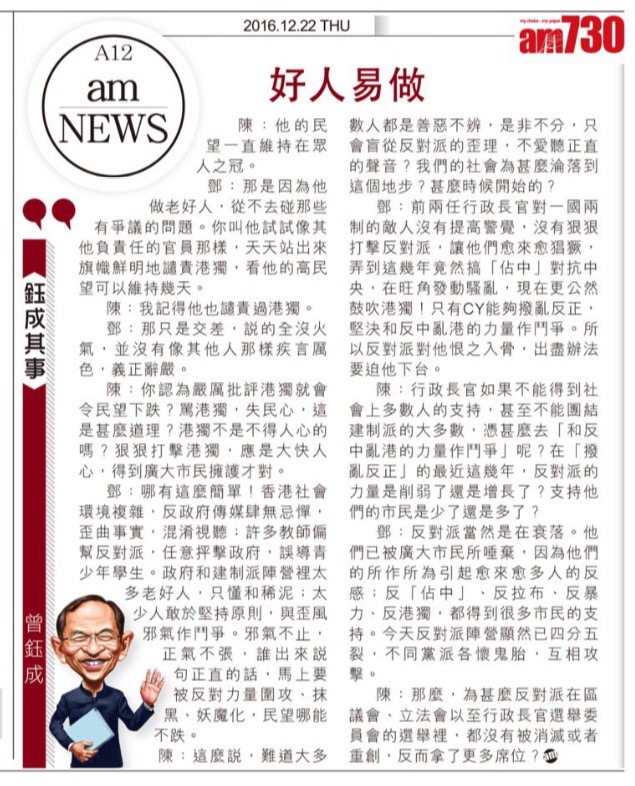 鄧:那是因為他做老好人,從不去碰那些有爭議的問題。你叫他試試像其他負責任的官員那樣,天天站出來旗幟鮮明地譴責港獨,看他的高民望可以維持幾天。