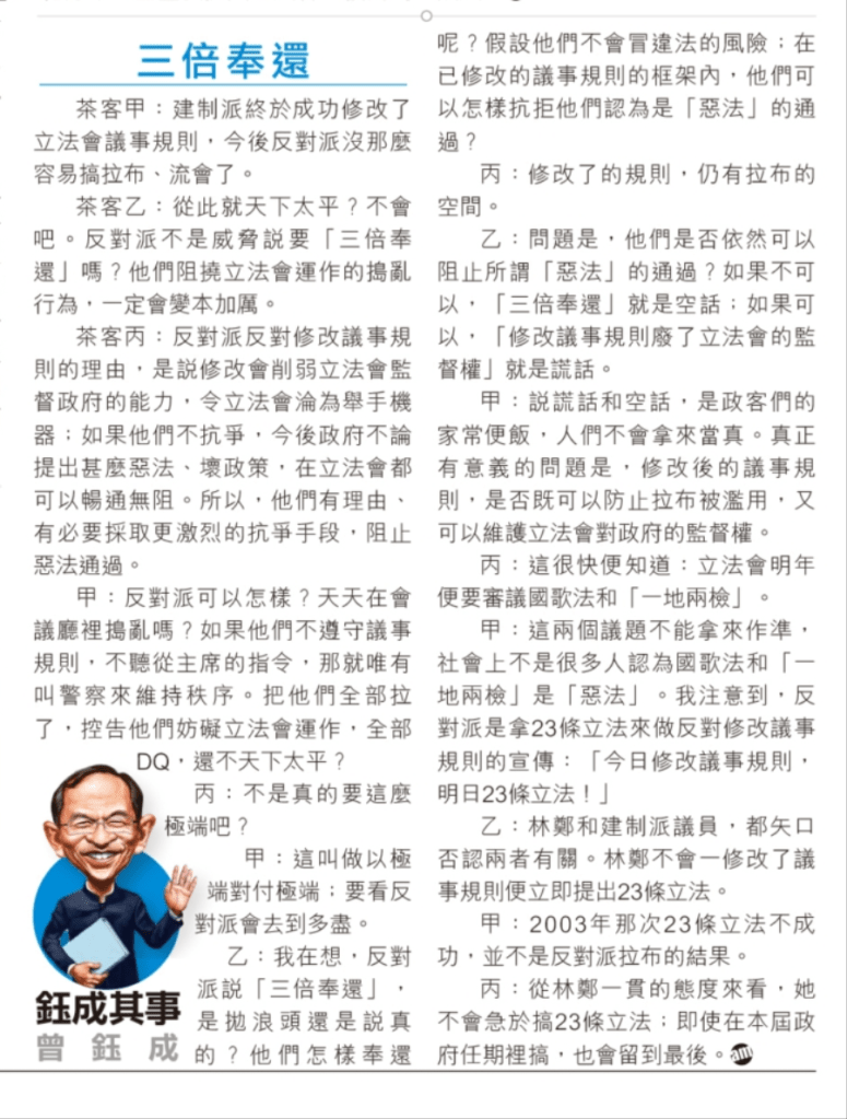 乙:我在想,反對派說「三倍奉還」,是拋浪頭還是說真的?他們怎樣奉還呢?假設他們不會冒違法的風險;在已修改的議事規則的框架內,他們可以怎樣抗拒他們認為是「惡法」的通過?
