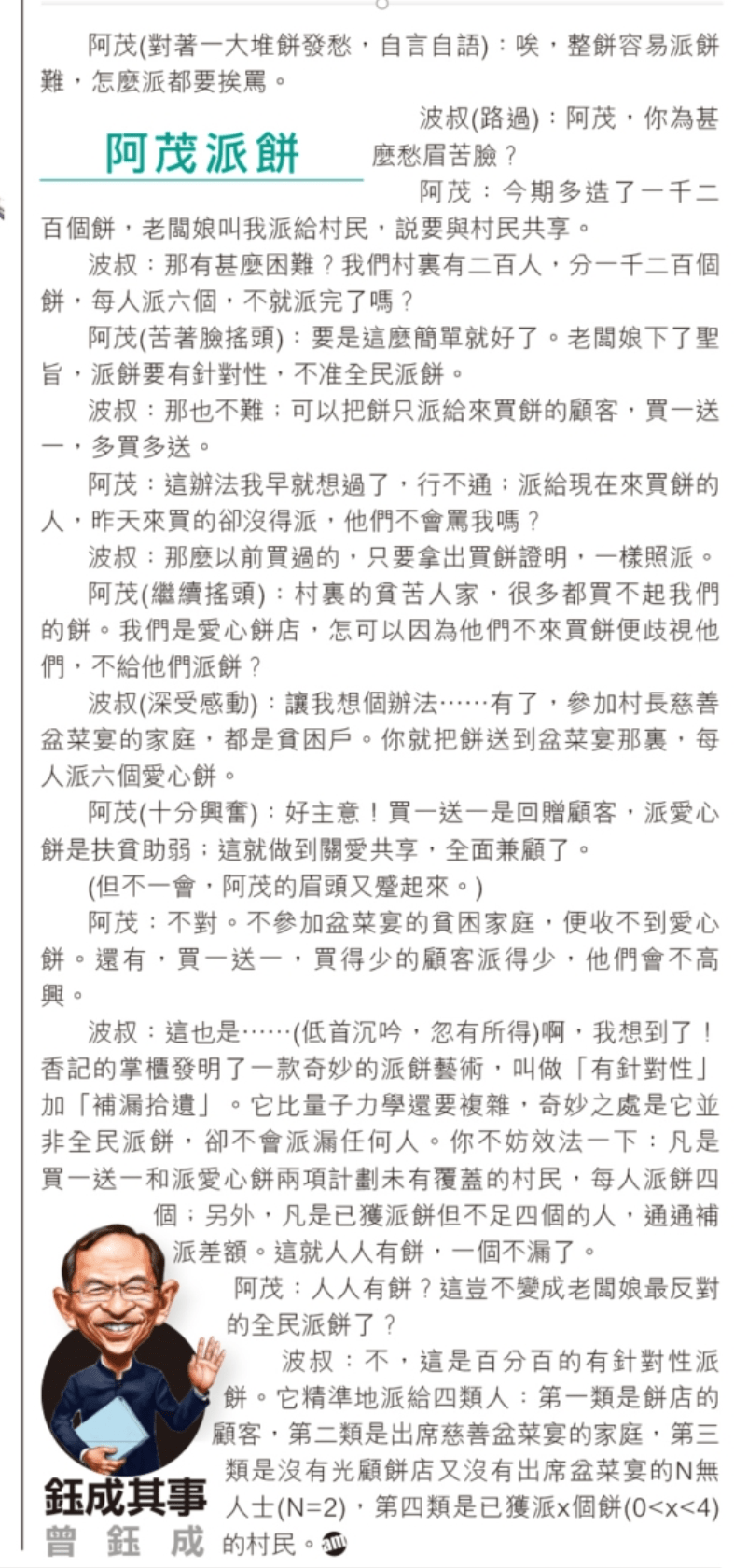 波叔:這也是……(低首沉吟,忽有所得)啊,我想到了!香記的掌櫃發明了一款奇妙的派餅藝術,叫做「有針對性」加「補漏拾遺」。它比量子力學還要複雜,奇妙之處是它並非全民派餅,卻不會派漏任何人。你不妨效法一下:凡是買一送一和派愛心餅兩項計劃未有覆蓋的村民,每人派餅四個;另外,凡是已獲派餅但不足四個的人,通通補派差額。這就人人有餅,一個不漏了。