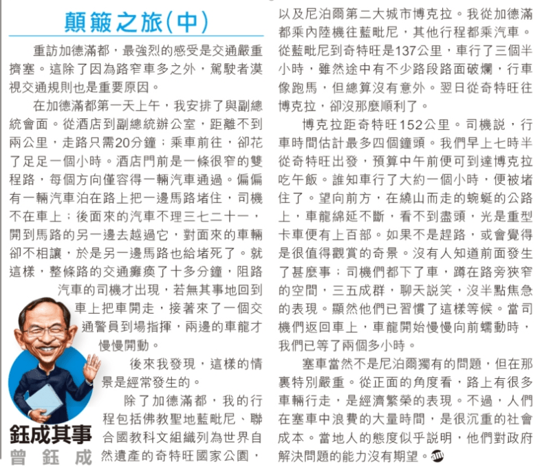 塞車當然不是尼泊爾獨有的問題,但在那裏特別嚴重。從正面的角度看,路上有很多車輛行走,是經濟繁榮的表現。不過,人們在塞車中浪費的大量時間,是很沉重的社會成本。當地人的態度似乎說明,他們對政府解決問題的能力沒有期望。