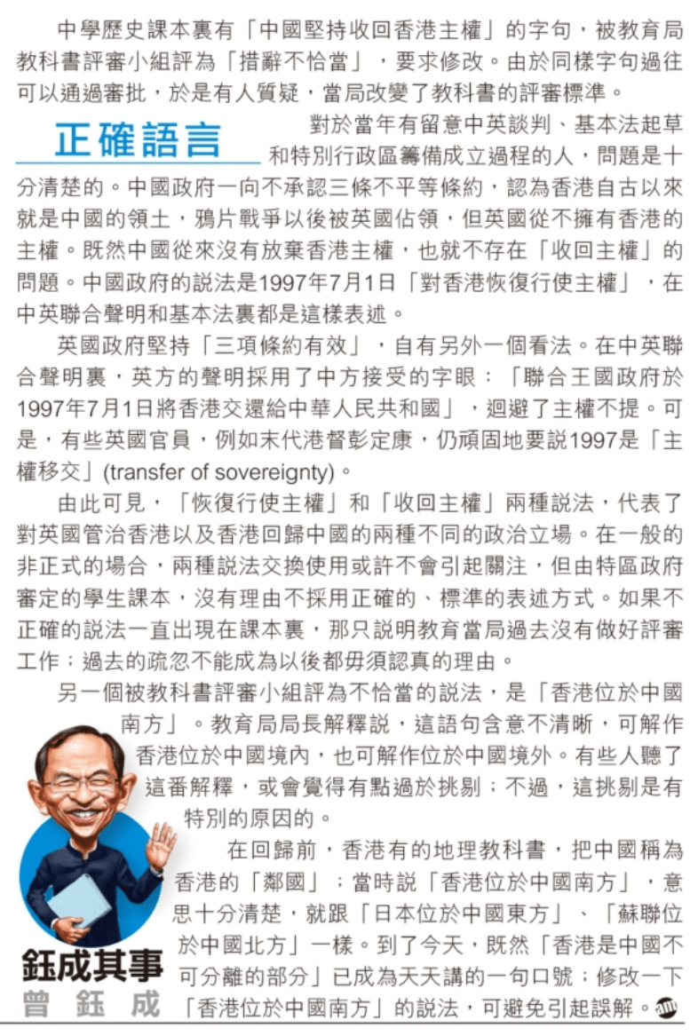 中學歷史課本裏有「中國堅持收回香港主權」的字句,被教育局教科書評審小組評為「措辭不恰當」,要求修改。由於同樣字句過往可以通過審批,於是有人質疑,當局改變了教科書的評審標準。