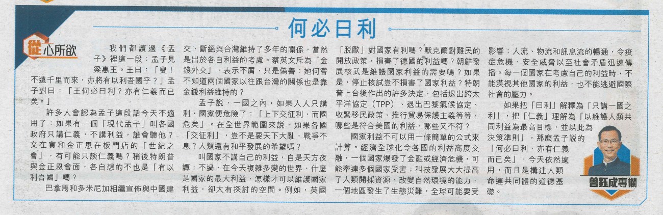 如果把「曰利」解釋為「只講一國之利」,把「仁義」理解為「以維護人類共同利益為最高目標,並以此為決策準則」,那麼孟子說的「何必曰利,亦有仁義而已矣」,今天依然適用,而且是構建人類命運共同體的道德基礎。(完)