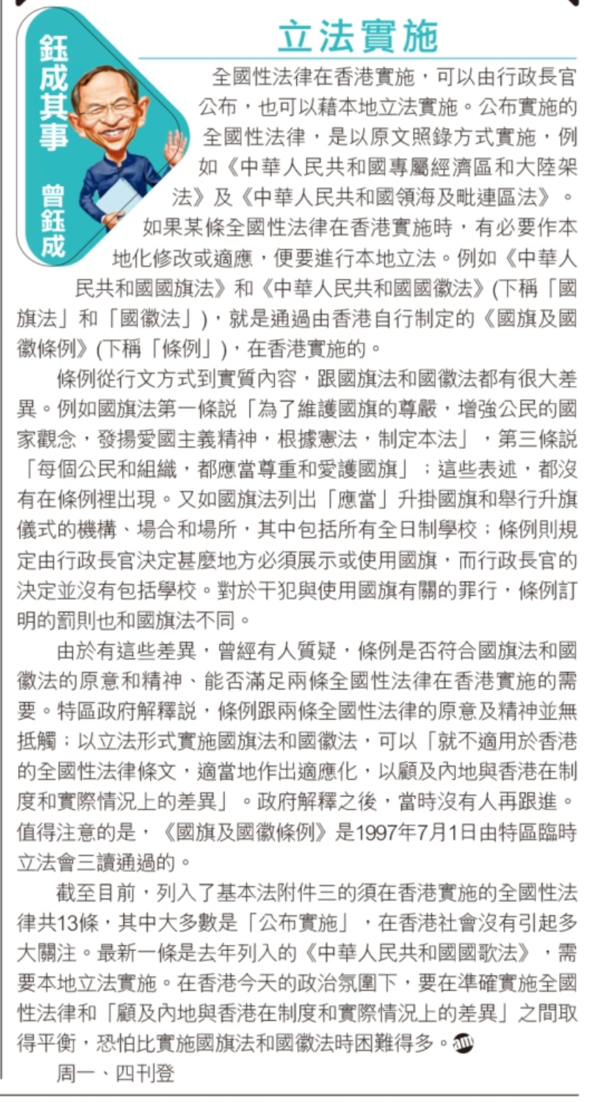 截至目前,列入了基本法附件三的須在香港實施的全國性法律共13條,其中大多數是「公布實施」,在香港社會沒有引起多大關注。最新一條是去年列入的《中華人民共和國國歌法》,需要本地立法實施。在香港今天的政治氛圍下,要在準確實施全國性法律和「顧及內地與香港在制度和實際情況上的差異」之間取得平衡,恐怕比實施國旗法和國徽法時困難得多。