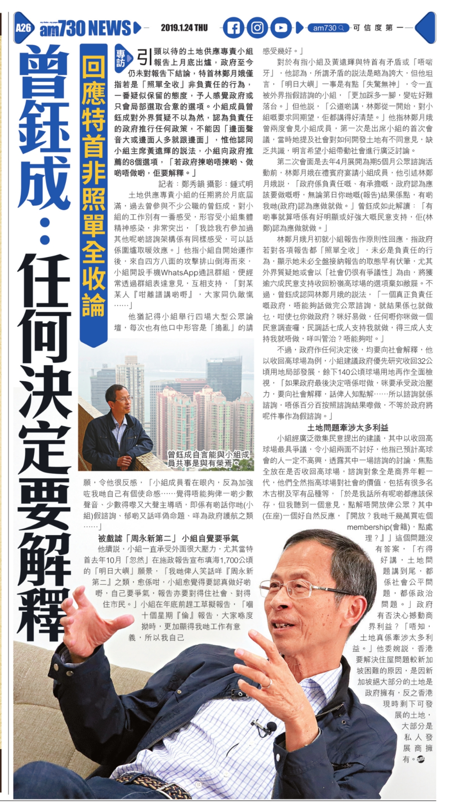 引頸以待的土地供應專責小組報告上月底出爐,政府至今仍未對報告下結論,特首林鄭月娥僅指若是「照單全收」非負責任的行為,一番疑似保留的態度,予人感覺政府或只會局部選取合意的選項。小組成員曾鈺成對外界質疑不以為然,認為負責任的政府推行任何政策,不能因「邊面聲音大或邊面人多就跟邊面」,惟他認同小組主席黃遠輝的說法,小組向政府推薦的8個選項,「若政府揀啲唔揀啲、做啲唔做啲,佢要解釋。」