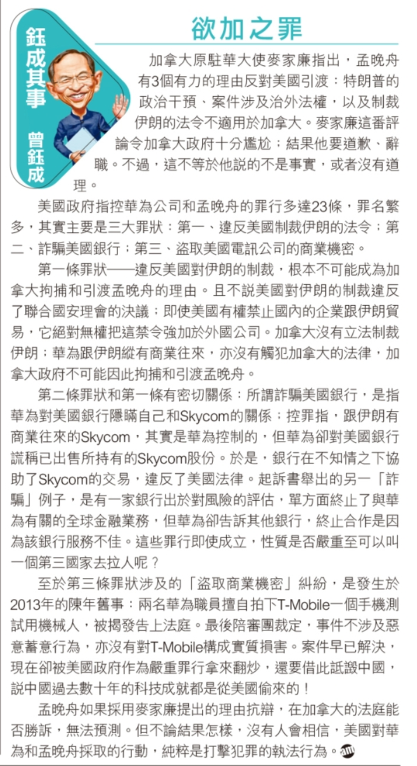 第一條罪狀——違反美國對伊朗的制裁,根本不可能成為加拿大拘捕和引渡孟晚舟的理由。且不說美國對伊朗的制裁違反了聯合國安理會的決議;即使美國有權禁止國內的企業跟伊朗貿易,它絕對無權把這禁令強加於外國公司。加拿大沒有立法制裁伊朗;華為跟伊朗縱有商業往來,亦沒有觸犯加拿大的法律,加拿大政府不可能因此拘捕和引渡孟晚舟。