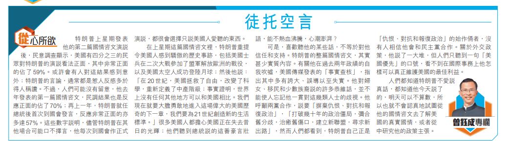 特朗普上星期發表他的第二篇國情咨文演說後,民意調查顯示,美國有四分之三的民眾對特朗普的演說看法正面,其中非常正面的佔了59%。或許會有人對這結果感到意外;特朗普的言論,通常都是惹人反感多於得人稱讚。不過,人們可能沒有留意,他去年發表的第一篇國情咨文,民調結果也是反應正面的佔了70%;再上一年,特朗普就任總統後首次到國會發言,反應非常正面的亦多達57%。這些數字說明,儘管特朗普在其他場合可能口不擇言,他每次到國會作正式演說,都很會選擇只說美國人愛聽的東西。