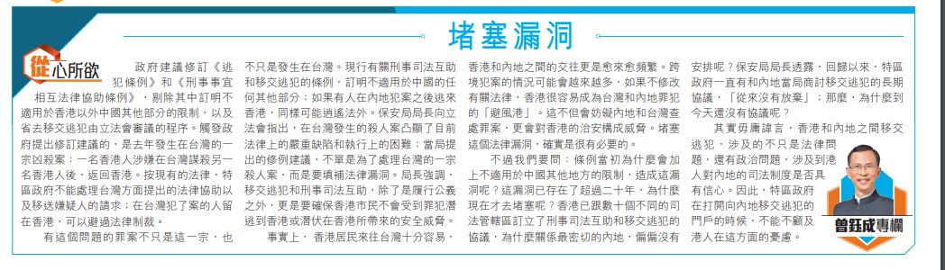 事實上, 香港居民來往台灣十分容易,香港和內地之間的交往更是愈來愈頻繁。跨境犯案的情況可能會愈來愈多,如果不修改有關法律,香港很容易成為台灣和內地罪犯的「避風港」。這不但會妨礙內地和台灣查處罪案,更會對香港的治安構成威脅。堵塞這個法律漏洞,確實是很有必要的。