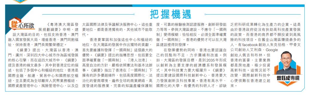在發揮優勢的同時,香港也要認識自己的弱點和不足,力求彌補和改進。例如,大灣區的發展目標,是到2035年形成以創新為主要支撐的經濟體系和發展模式,其中科技實力要大幅躍升。《綱要》提出要建設國際科技創新中心,香港要大力發展創新及科技事業。香港有高水平、國際化的大學,有優秀的科研人才,卻缺乏把科研成果轉化為生產力的企業。這是由於香港政府從沒有扶助高科技產業發展的政策,而香港的商界都不願投資到高風險的科技項目。在舊金山灣區賺錢最多的人,有facebook創始人朱克伯格、甲骨文公司創始人艾利森、Google創始人佩吉和布林。但香港的富豪,主要業務都是房地產,極少投資高新科技。這情況不改變,國際創新科技中心便很難在香港建立起來。