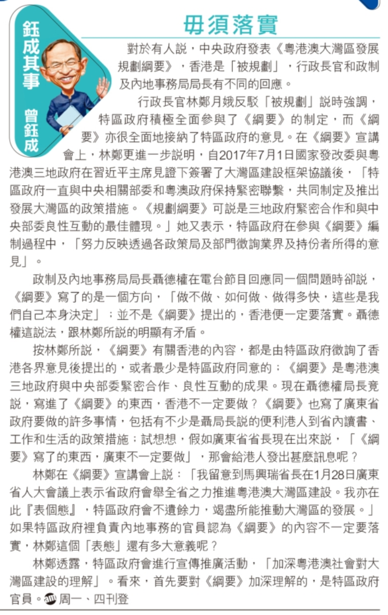 林鄭在《綱要》宣講會上說:「我留意到馬興瑞省長在1月28日廣東省人大會議上表示省政府會舉全省之力推進粵港澳大灣區建設。我亦在此『表個態』,特區政府會不遺餘力,竭盡所能推動大灣區的發展。」如果特區政府裡負責內地事務的官員認為《綱要》的內容不一定要落實,林鄭這個「表態」還有多大意義呢?