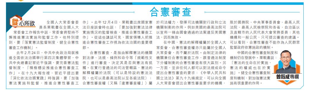 去年2月24日,中共中央政治局就推進全面依法治國舉行第四次集體學習,中共中央總書記習近平強調,要完善憲法監督制度,「積極穩妥推進合憲性審查工作」。在十九大報告裡,習近平提出要「深化依法治國實踐」時強調,要「加強憲法實施和監督,推進合憲性審查工作」。去年12月4日,栗戰書出席國家憲法日座談會時也說:「要加強對憲法法律實施情況的監督檢查,推進合憲性審查工作」。從這些講話可見,國家領導人把推進合憲性審查工作視為依法治國的重要環節。