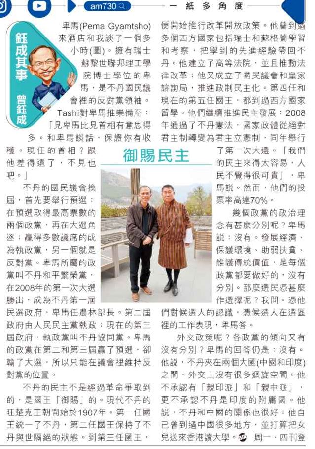 不丹的民主不是經過革命爭取到的,是國王「御賜」的。現代不丹的旺楚克王朝開始於1907年。第一任國王統一了不丹,第二任國王保持了不丹與世隔絕的狀態。到第三任國王,便開始推行改革開放政策。他曾到過多個西方國家包括瑞士和蘇格蘭學習和考察,把學到的先進經驗帶回不丹。他建立了高等法院,並且推動法律改革;他又成立了國民議會和皇家諮詢局,推進政制民主化。第四任和現在的第五任國王,都到過西方國家留學。他們繼續推進民主發展:2008年通過了不丹憲法,國家政體從絕對君主制轉變為君主立憲制,同年舉行了第一次大選。「我們的民主來得太容易,人民不覺得很可貴」,卑馬說。然而,他們的投票率高達70%。