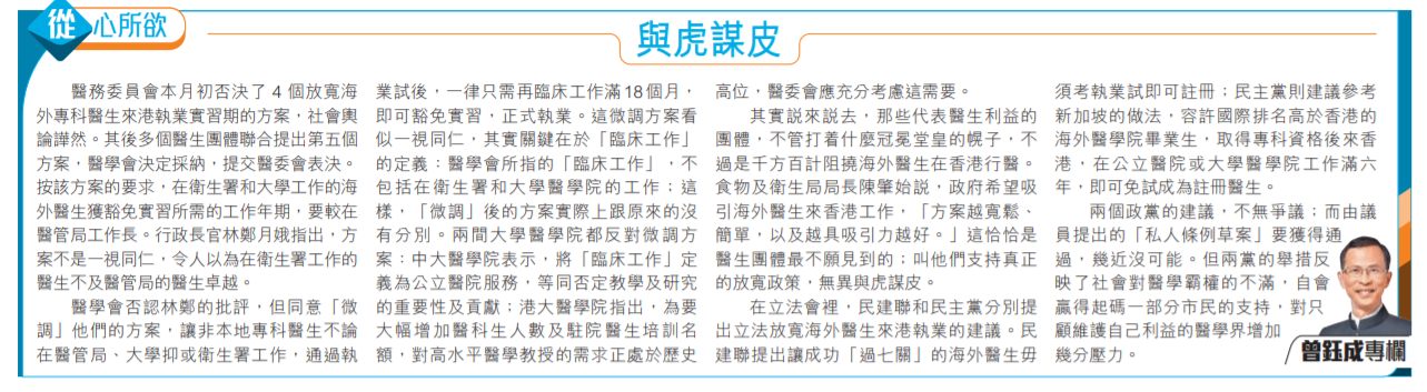 其實說來說去,那些代表醫生利益的團體,不管打着甚麼冠冕堂皇的幌子,不過是千方百計阻撓海外醫生在香港行醫。食物及衛生局局長陳肇始說,政府希望吸引海外醫生來香港工作,「方案越寬鬆、 簡單,以及越具吸引力越好。」這恰恰是醫生團體最不願見到的;叫他們支持真正的放寬政策,無異與虎謀皮。
