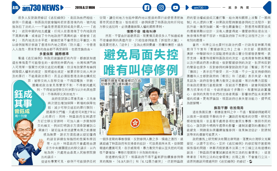 在這樣的情況下,特區政府不得不重新評估續推修例帶來的風險。「6.9大遊行」和「6.12暴力衝突」,已對特區政府的管治權威造成沉重打擊,給台灣和國際上攻擊「一國兩制」的人提供口實。如果政府堅持推進修例的立法程序,對抗升級,衝突加劇,萬一發生嚴重傷亡,對香港和國家造成的傷害將難以估計,沒有人擔當得起。儘管修例合理合法,無奈情和勢都不容許。特區政府除了叫停立法程序之外,沒有別的選擇。