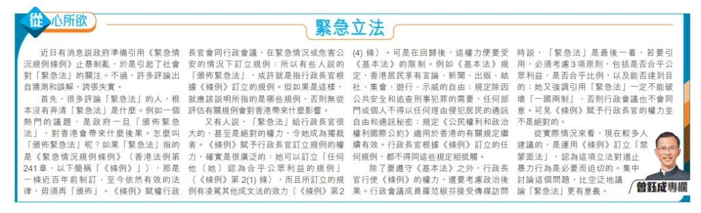 從實際情況來看,現在較多人建議的,是運用《條例》訂立「禁蒙面法」,認為這項立法對遏止暴力行為是必要而迫切的。集中討論這個問題,比空泛地議論「緊急法」更有意義。(完)