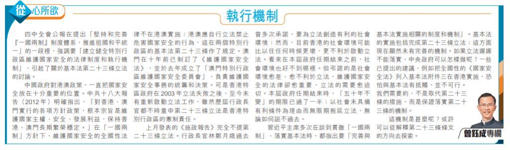 四中全會公報在提出「堅持和完善『一國兩制』制度體系,推進祖國和平統一」的一段裡,強調要「建立健全特別行政區維護國家安全的法律制度和執行機制」,引起了關於基本法第二十三條立法的討論。