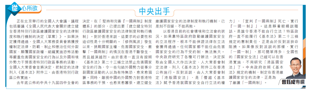 反對派說,由人大常委會制定「港版國安法」,是「僭越《基本法》賦予香港就國家安全自行立法的權力」,「宣判『一國兩制』死亡,實行『一國一制』」。這是睜着眼睛說瞎話。是誰令香港不能自行立法?特區政府一直不能履行《基本法》第二十三條規定的憲制責任,正是由於反對派拼命阻撓。如果像反對派說的那樣,實行「一國一制」,那可簡單得多:全國性的「國家安全法」已經可以在香港實施,不用研究「港版國安法」了。中央政府依照《基本法》規定的機制,制定在香港維護國家安全的法律,正是為了維護「一國兩制」。(完)