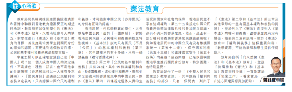 教育局局長楊潤雄回應國務院港澳辦和香港中聯辦對香港教育撥亂反正的期望時承諾,教育局將加強對學生的《憲法》和《基本法》教育。