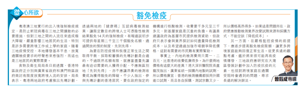 粵港澳三地實行的出入境強制檢疫規定,是防止新冠病毒在三地之間擴散的必要措施,但對三地之間的人流往來造成極大障礙,嚴重影響三地居民的生活,特別是許多需要跨境工作或上學的家庭。隨着三地疫情受控,本地爆發基本平息,放寬通關檢疫要求的呼聲愈來愈強烈,而這也是三地區民的實際需要。