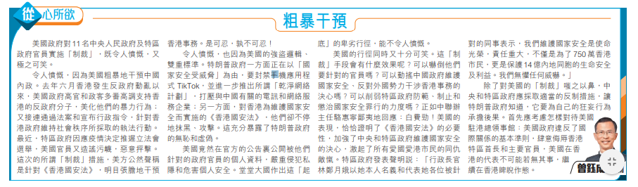 令人憤慨,因為美國粗暴地干預中國內政。去年六月香港發生反政府動亂以來,美國政府高官和政客多番高調支持香港的反政府分子,美化他們的暴力行為;又接連通過法案和宣布行政指令,針對香港政府維持社會秩序所採取的執法行動。最近,特區政府因應疫情決定推遲立法會選舉,美國官員又造謠污蔑,惡意抨擊。這次的所謂「制裁」措施,美方公然聲稱是針對《香港國安法》,明目張膽地干預香港事務。是可忍,孰不可忍!