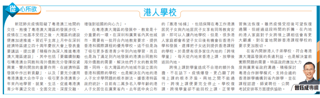 同時,在大灣區的內地城市設立面向香港和國際的學校,也是解決在內地的港人子女求學問題的根本辦法。據香港特區政府統計,目前有二萬多名入學年齡的港人子女居住在廣東省內。去年底中央公布的「惠港16條」,包括保障在粵工作港澳居民子女與內地居民子女享有同等教育安排,即可以入讀內地學校;但是,很多港人家庭都會希望子女日後有機會在香港升學和發展,選擇把子女送到提供香港課程的學校。於是便有很多家住內地的「跨境學童」,每天從內地來香港上課,放學後返回內地。