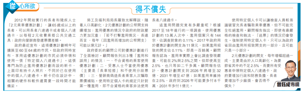 二元優惠計劃的開支,每年增幅超過一成,主要是由於人口高齡化。為要節省其中的不足2.5%,而要所有受惠者申領特定個人八達通卡,政府要增加行政和財務負擔,長者要增加不少麻煩,會否得不償失?(完)