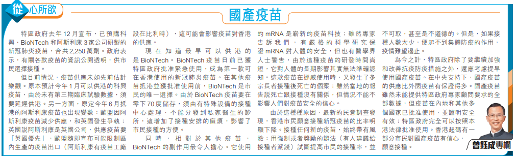 為今之計,特區政府除了要繼續加強和改善抗疫防疫措施之外,還應考慮提早使用國產疫苗。在中央支持下,國產疫苗的供應比外國疫苗有保證得多。國產疫苗雖然未能提供特區政府專家顧問要求的全部數據,但疫苗在內地和其他多個國家已批准使用,並證明安全有效;特區政府完全可以按照本港法律批准使用。香港起碼有一部分市民對國產疫苗有信心,願意接種。(完)